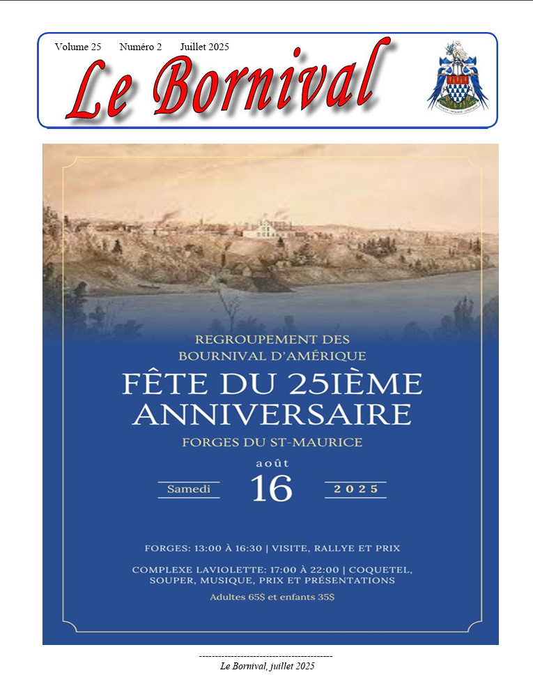 Si la recherche des liens parentaux et l’histoire des Bournival vous intéresse, nous nous ferons un plaisir de pouvoir répondre à certaines de vos questions et de partager avec vous les découvertes que nous avons faites, notamment sur les premières générations de Bournival en Amérique ou sur nos origines européennes qui remontent aussi loin qu’au XIIIe siècle.